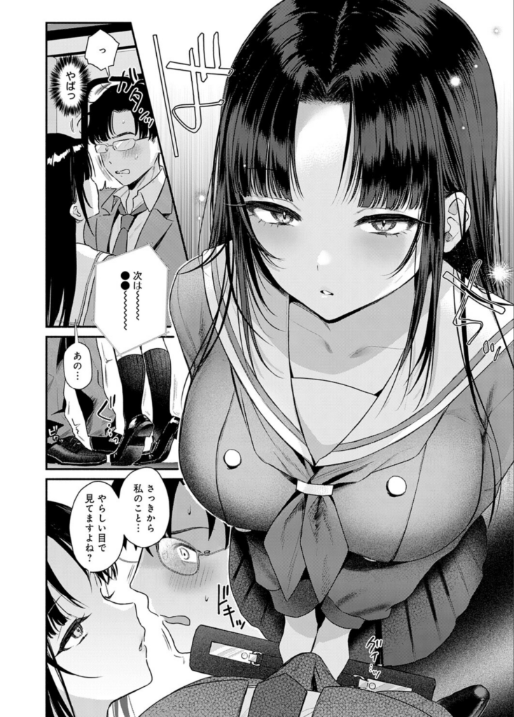 狼狽える主人公の手を引き、彼女が向かったのは駅の公衆トイレ。密室へと彼を連れ込んだ彼女は、クールな表情を崩さぬまま告げます。「私はずっとあなたの視線……あなたのこと……やらしいなぁ……って思ってたんですよ。お互い様ですね?」と。そこから始まるのは、女子高生による主導権を握った逆ナンパSEX。巨乳を揺らし、慣れた手つきで責め立てる彼女の前に、主人公の理性は一瞬で溶け去っていくのでした。